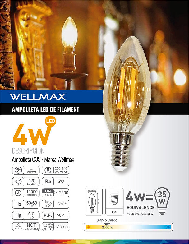 La Ampolleta Vela WELLMAX 4W combina un diseño clásico con iluminación eficiente, siendo ideal para sustituir bombillas incandescentes. Su luz cálida ámbar de 2500K crea ambientes acogedores en hogares, cafeterías, bares, restaurantes, hoteles y otros espacios comerciales.